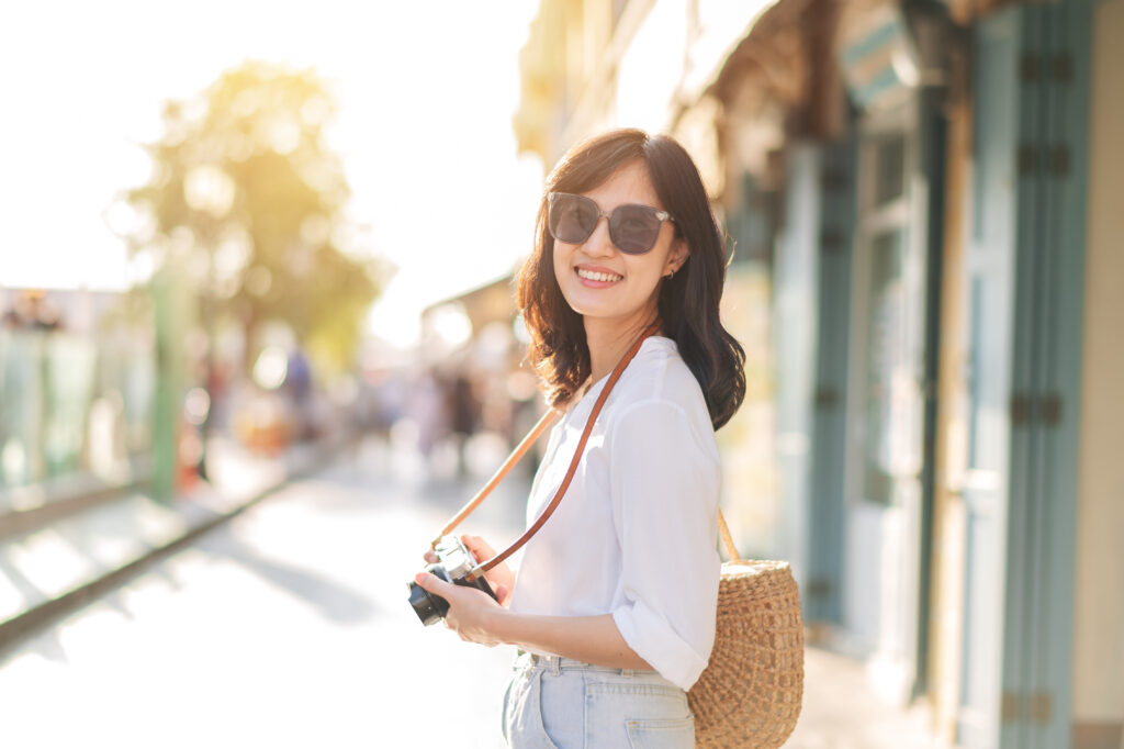 Portrait of young beautiful woman with camera explore street in Bangkok, Thailand