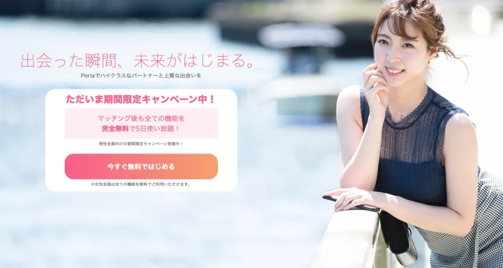 | 9位/433点 Peria | 新しいパパ活サイト 無料登録する | 無料 | 5,400円/月〜 完全定額 | なし | 女性 20〜30代中心 男性 30〜50代中心 | 本人確認 24時間監視 通報制度 |