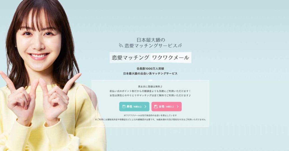 9位/430点![]() ワクワク | とにかく老舗 無料登録する | 無料 | ポイント制 1P=11円 | なし | 男女ともに 20歳〜50歳中心 | 本人確認 24時間監視 通報制度 |