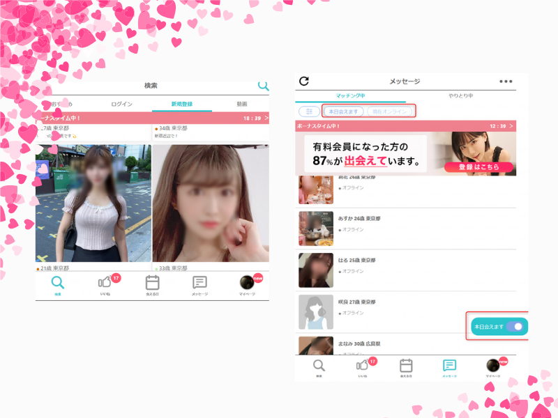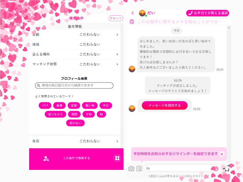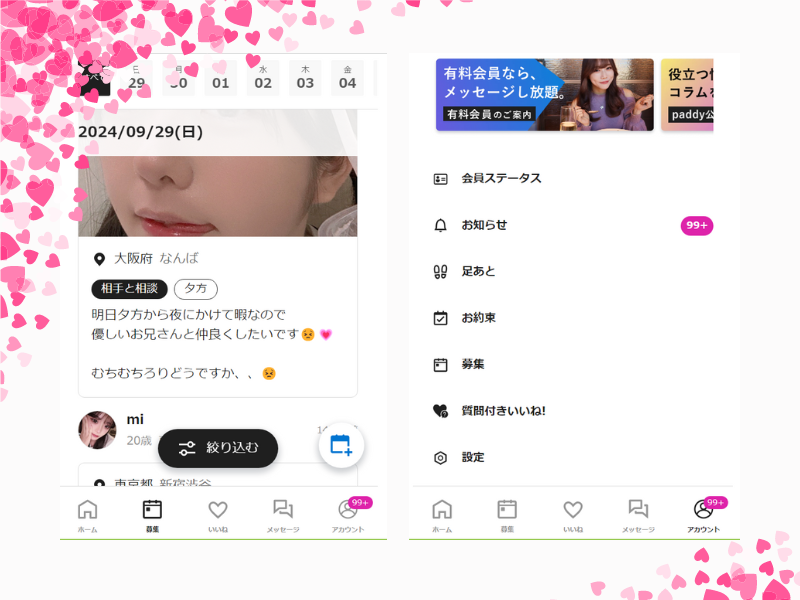 ちょっと変わっているのが「当日パパ活募集」のためのパパ活タイムライン機能と日付つき予約機能があります。