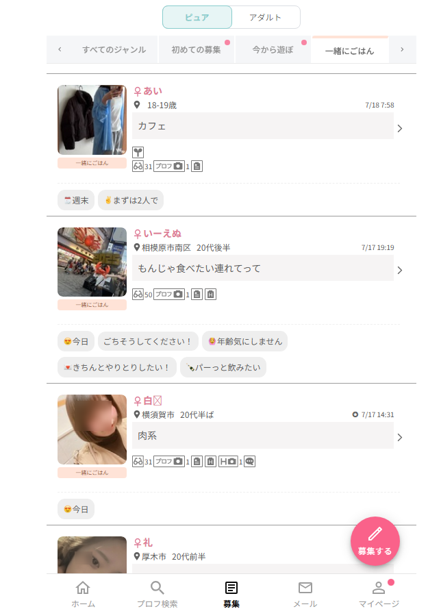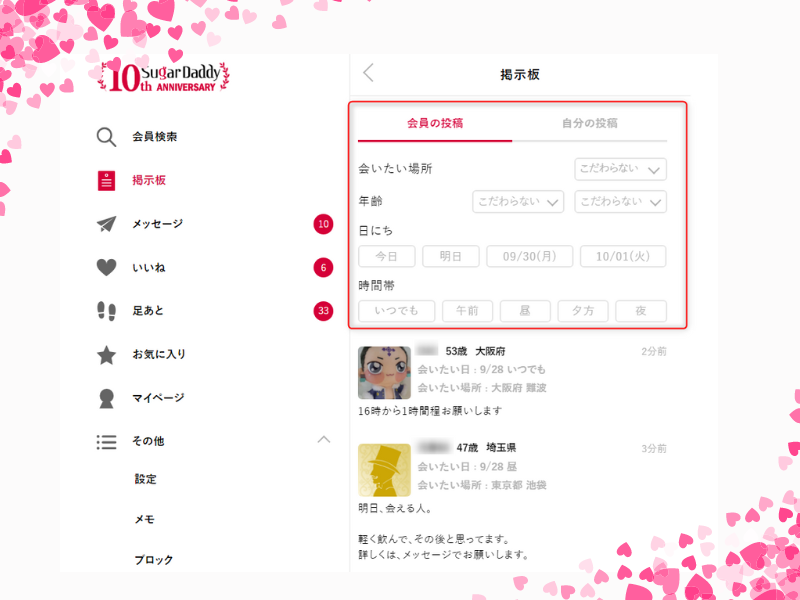 パパ活アプリの中には「当日の相手募集掲示板」というコーナーがあります。別に使わなくてもプロフィールと自己紹介をきちんと書いておけばすぐにマッチしますし、シュガダのように相手の最終ログイン履歴を見て「いいね!」+「メッセージ」でアプローチの方が良い人が見つかります。
