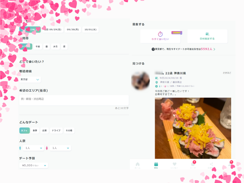 会える時間帯、行きたい場所・大体の予算と内容について書きこんで募集ボタンを押すと今すぐあってみたい人に一覧で募集要件が表示される仕組みです。