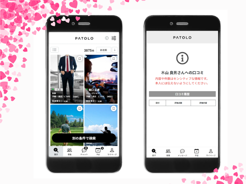6位/460点![]() PATOLO | ハイスペック専用 無料登録する | 無料 | 入会金:11,000円〜 タレント料:女性により異なる 調整料:加盟店により異なる | なし | 女性 20代が7割 男性 40〜60代 | 本人確認 審査あり コンシェルジュ |