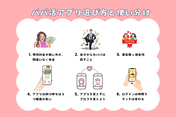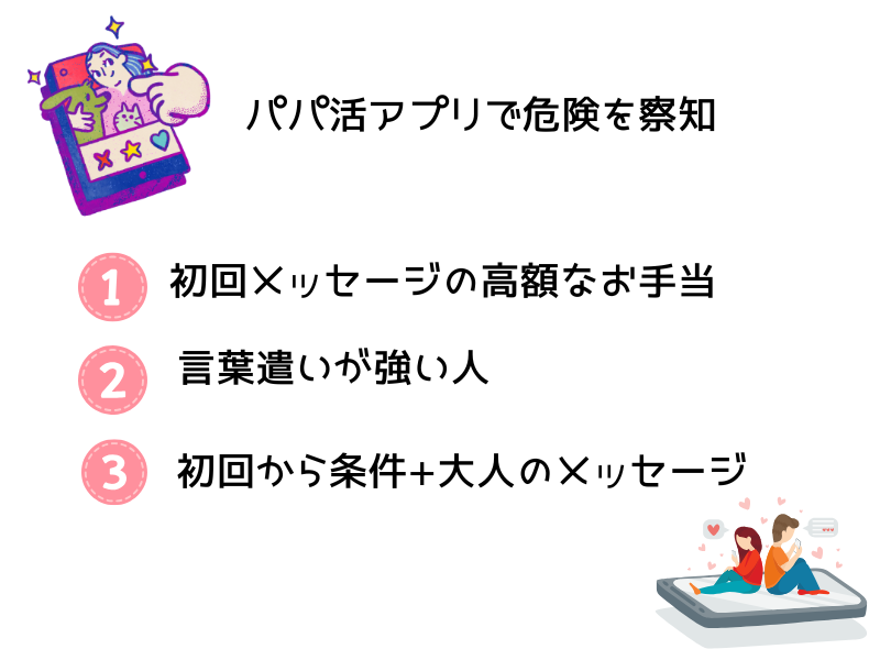 その際に重要になるのがアプリ内で事前に「悪質なパパ」を避けることです。悪質なパパを避けることができれば、素敵なパパと出会える確率が上がるので、パパ活がうまくいきやすくなるわけですね。