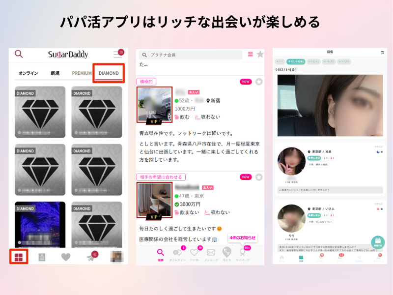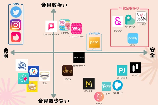 また、安全性というのは晒し行為がないもの。そしてシークレットやブロック機能です。太パパが多いかどうかはVIP表示があるかどうか、アプリの利用料金が5000円以上で、お金がない男性が入り込まないかどうかを基準にしました。