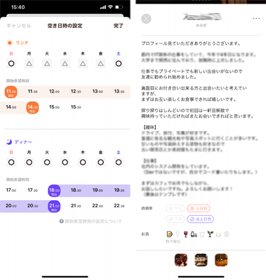 最小限のやり取りでマッチングできますが、お食事の前日や当日に予定確認のメッセージは送るようにしてくださいね。